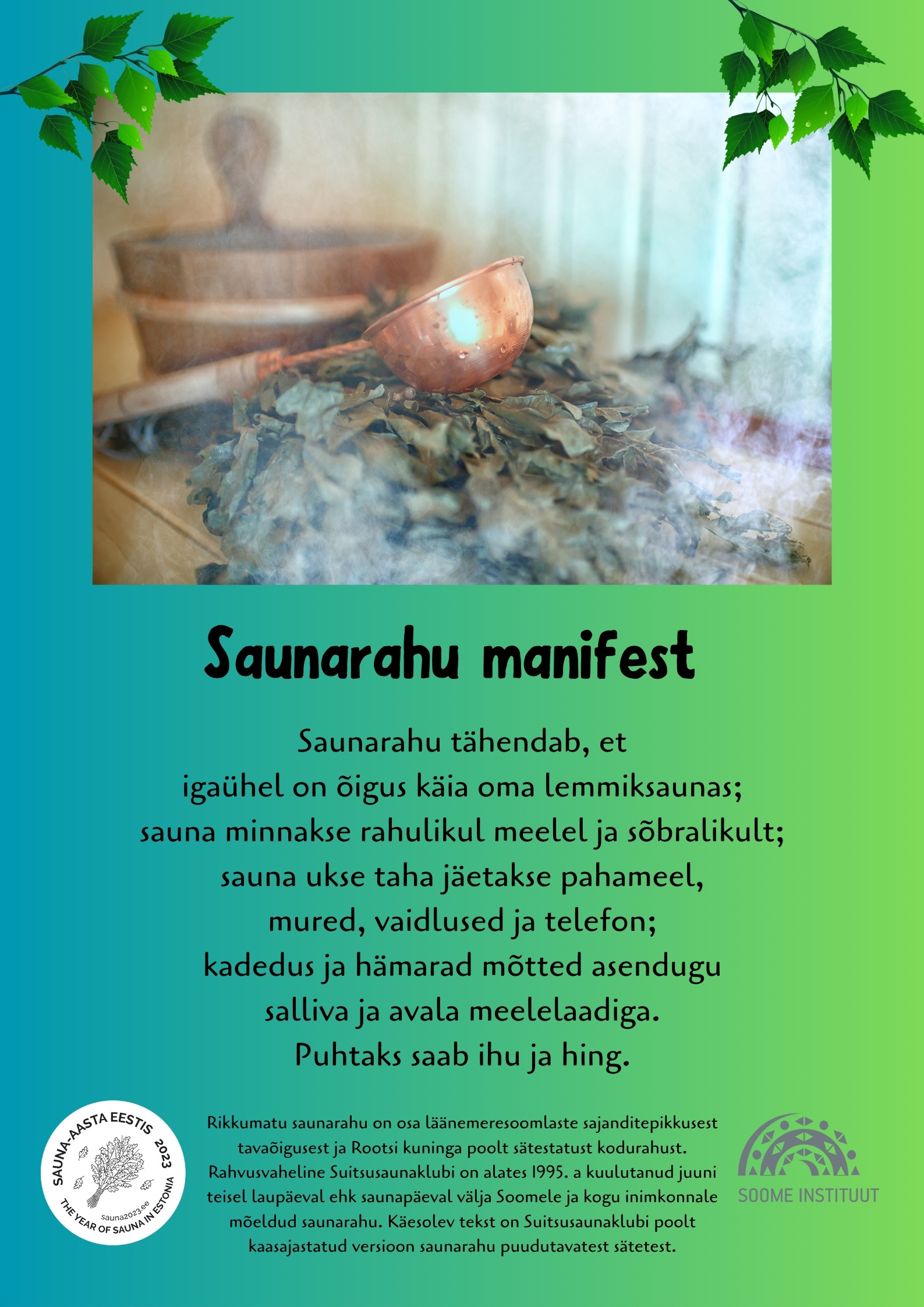 Eesti Maaturismi Ühing jagab saunaomanikele ja avalikele saunadele saunarahu manifesti - see on kõigile soovijatele allalaetav eesti, võro, soome, inglise, ukraina ja vene keeles.
