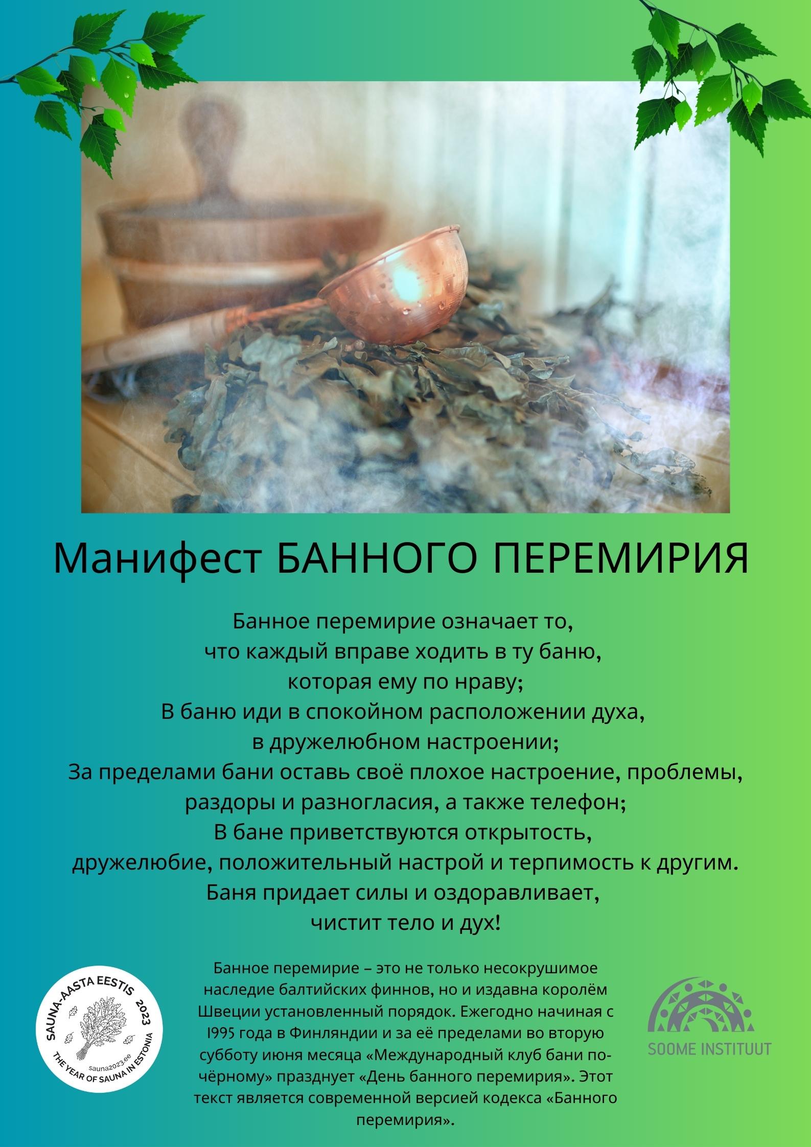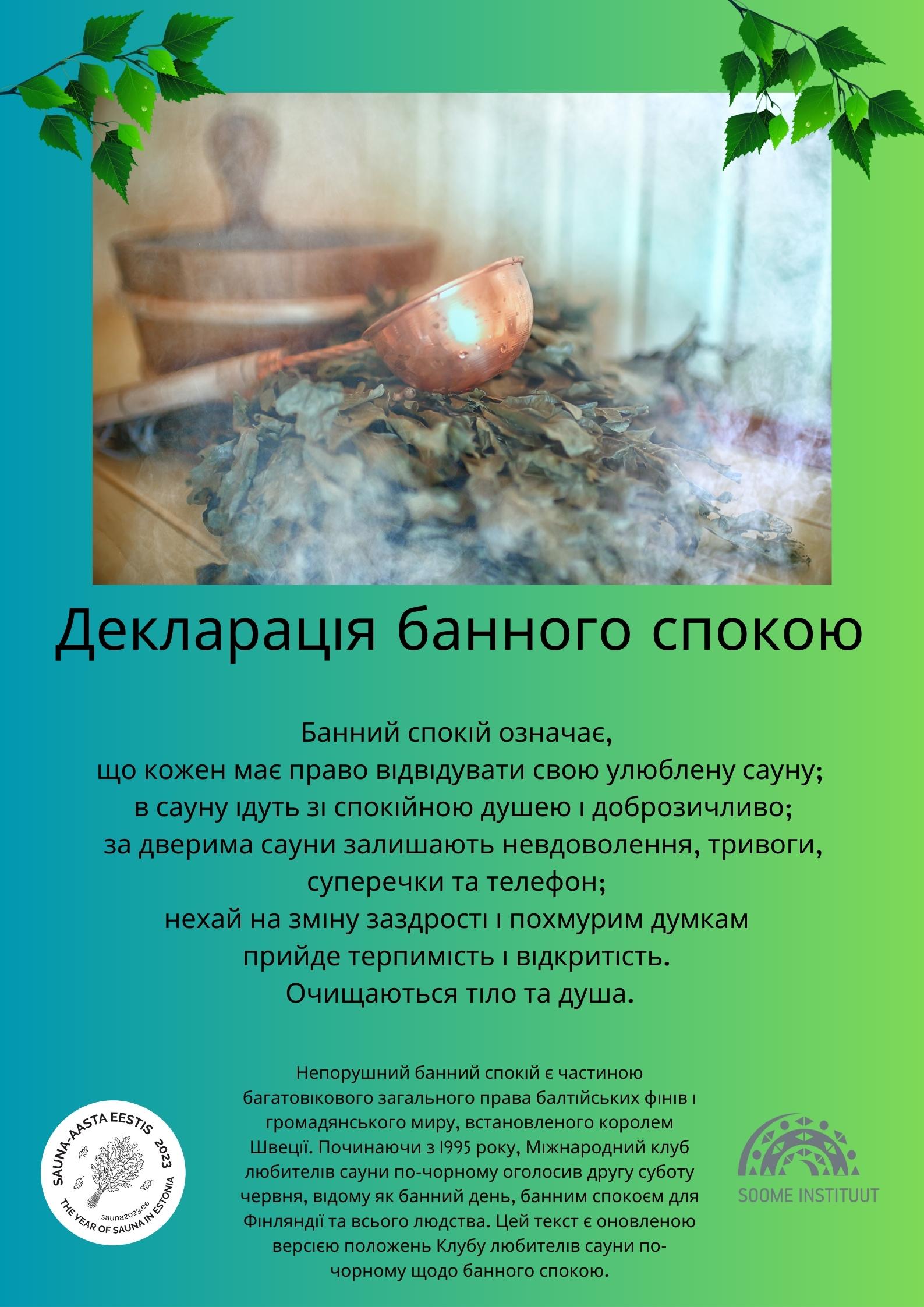 In Estonia, 2023 has been declared the Year of the Sauna. Therefore, the Estonian Rural Tourism Organization and the Finnish Institute invite all Estonians to celebrate Sauna Day on 10 June and to participating in announcement of the Declaration of Sauna Peace.