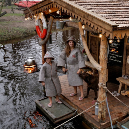 - Then your body will be ready for a floating peat sauna on the Kunda River. The sauna is built of blocks of peat, which make the sauna mild. On top of the sauna stove, there is a bowl of hot water, which gives the peat sauna its proper humidity. To get to the sauna, you have to walk along pontoons covered with peat slabs, and you also sit on peat slabs in the sauna. Various procedures are carried out in the sauna. Traditional peat procedures such as body masks, face masks, etc. are combined with a visit to the sauna so that the heat of the sauna can accelerate the processes. A unique feature is the peat sauna shower - a bucket with holes hanging from the eaves. On the walls of the sauna there are boxes with marsh plants that create an unforgettable atmosphere. Peat is a 100% natural product and contains no additives. Peat has a very wide therapeutic effect. It is used to relax muscles, cleanse the skin, speed up metabolism and detoxify the body.