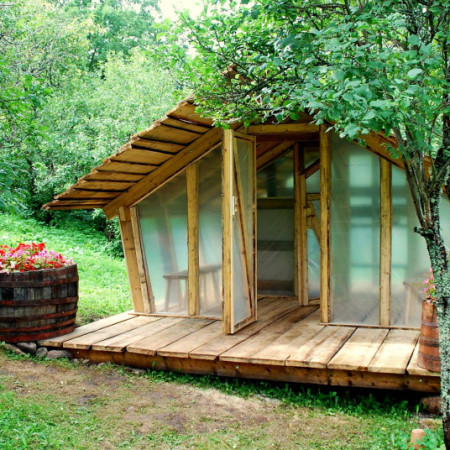 A temporary or "plastic sauna" provides a hint of what it is in its name. A simple sauna with no permanent connection to the ground, which can be built temporarily almost anywhere, with a frame made of material collected from the forest, covered with plastic and a sauna stove of natural stones. The simplicity of the plastic sauna should not be underestimated, however, as is confirmed by the sauna heat, which offers the same enjoyment as the historic saunas.