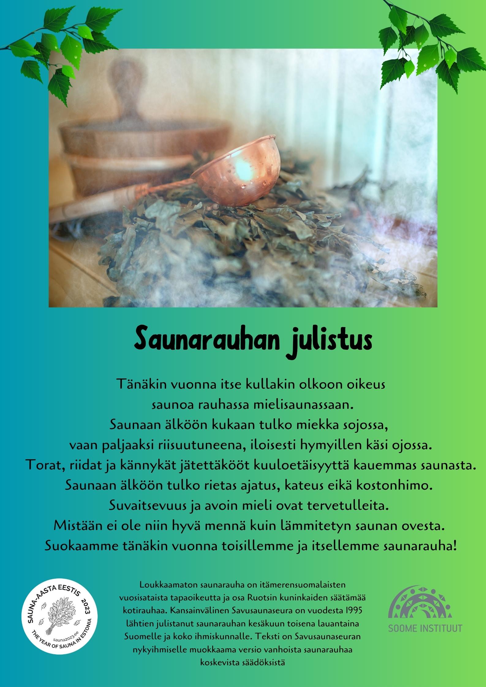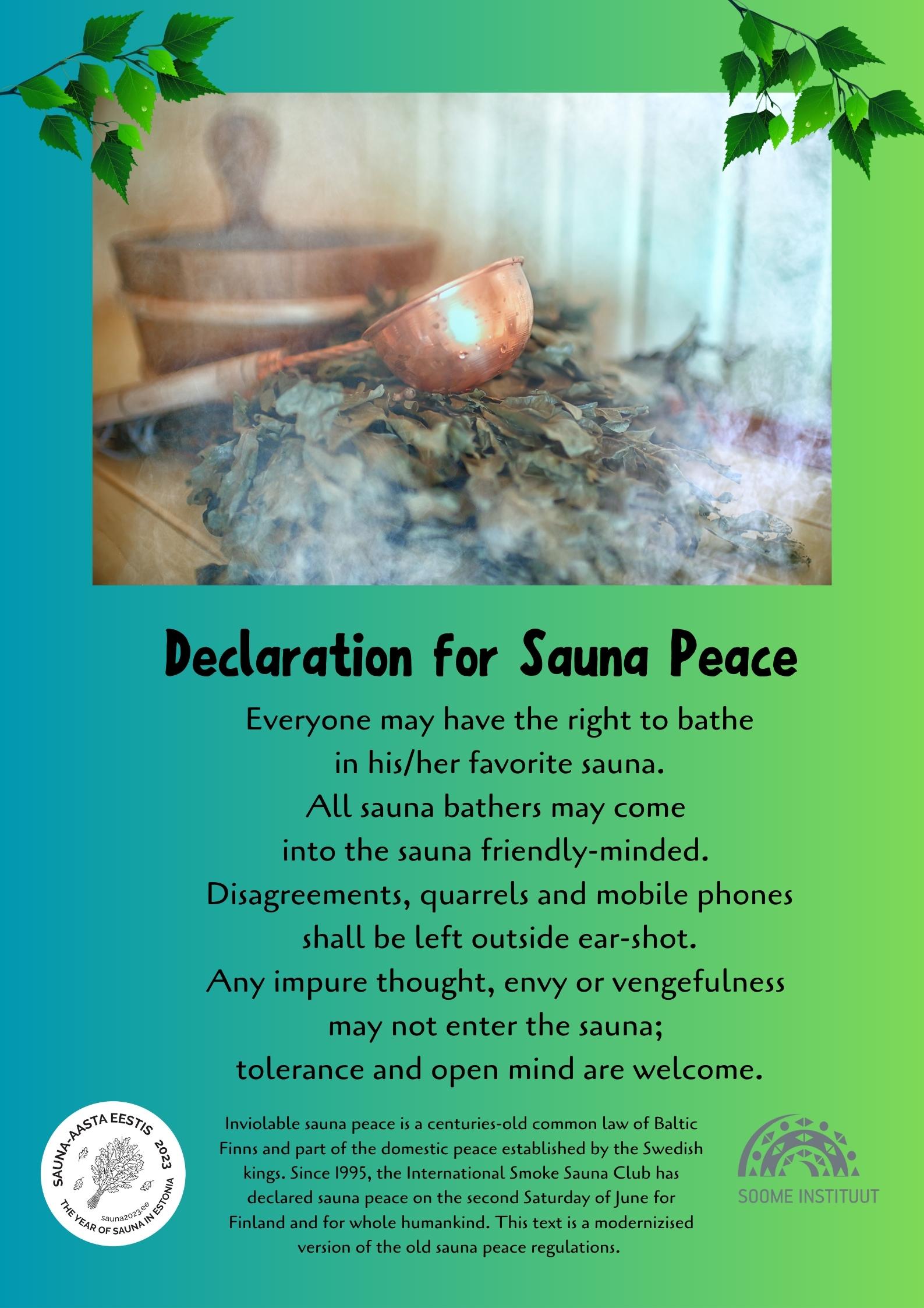 Eestis on aasta 2023 kuulutatud sauna-aastaks. Sestap kutsuvadki Eesti Maaturismi Ühing ja Soome Instituut kõiki eestlasi tähistama 10. juunit saunapäevana ja osalema saunarahu väljakuulutamisel.